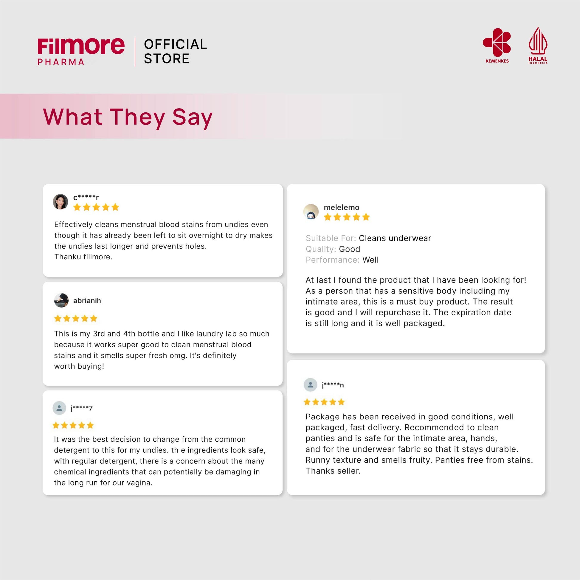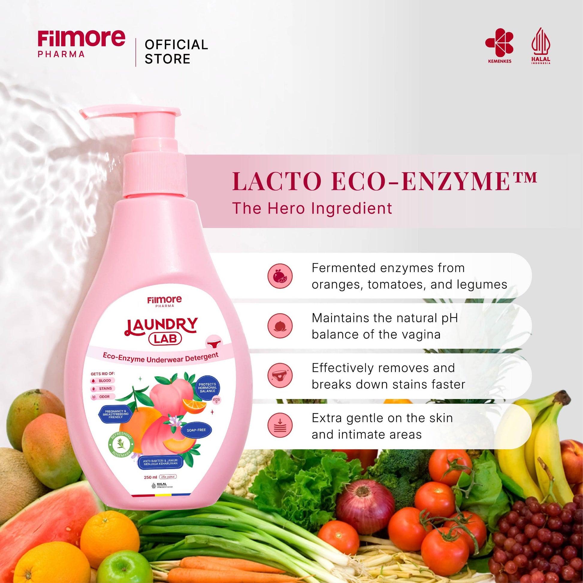 Soap-free underwear detergent that is more effective to remove protein-based stains such as vaginal discarge and period blood compared to conventional detergent. Made with Lacto Eco-Enzyme that is gentle for the skin, fabric, and is free from Endocrine Disruptive Chemicals (EDC).