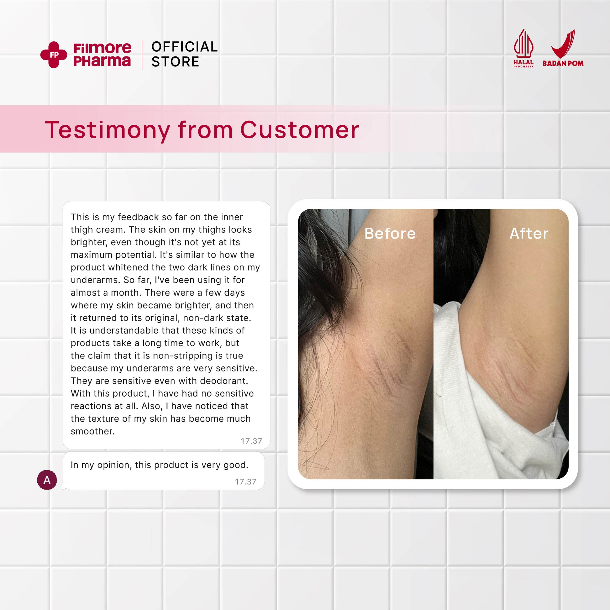 Brightens hyperpigmentation in the crease area (inner thigh, underarm, elbow, knees) that is usually caused by hormones in pregnant women, women in birth control pills, and women with PCOS.